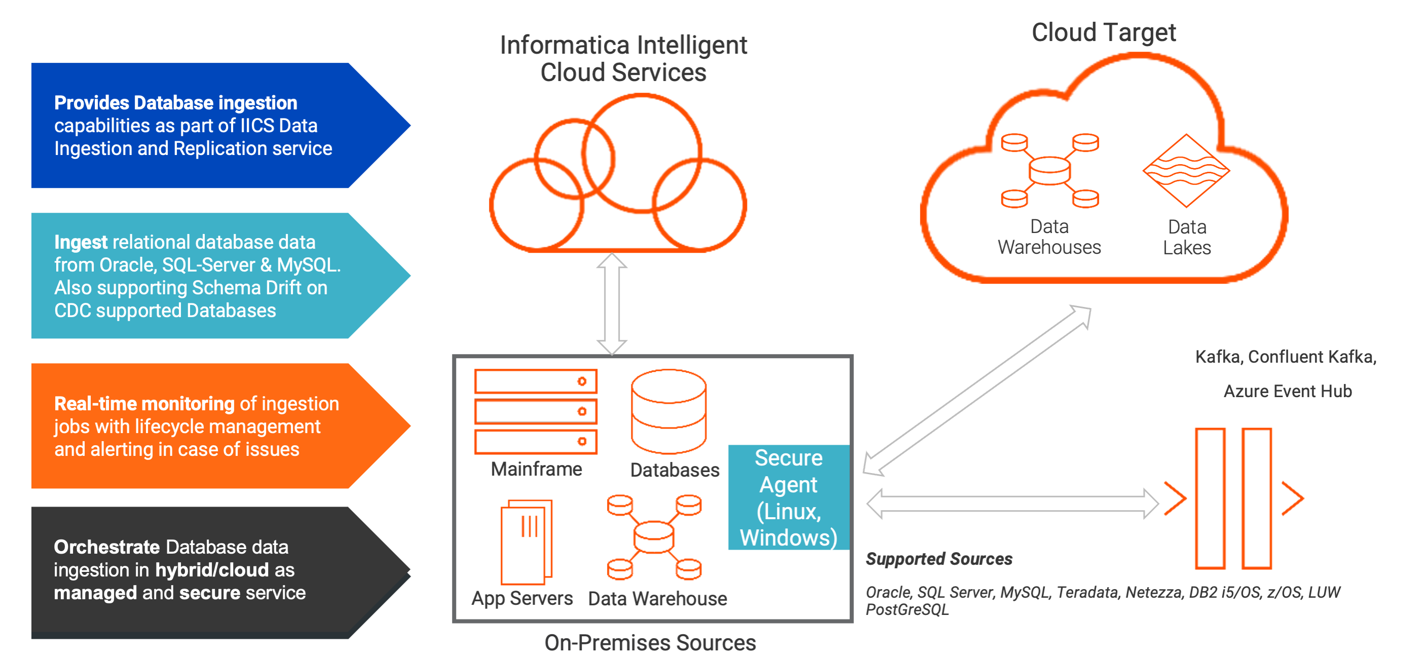 - Mass ingestion of on-premises database, data warehouse, and mainframe content into a cloud data warehouse (example: Snowflake)